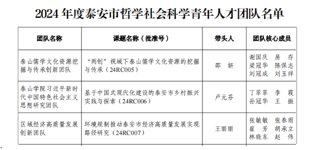 泰安市社会科学界联合会为深入贯彻落实习近平总书记关于哲学社会科学重要论述,进一步培育壮大全市哲学社会科学人才队伍,此次共立项建设10支青年人才团队,同时配套立项泰安市社会科学课题(青年人才专项)10项。