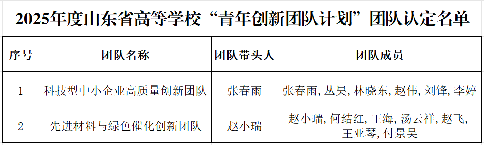 近日,山东省教育厅发布《关于公布2025年度山东省高等学校“青年创新团队计划”团队认定名单的通知》,学校推荐的“科技型中小企业高质量创新团队”“先进材料与绿色催化创新团队”获批立项。